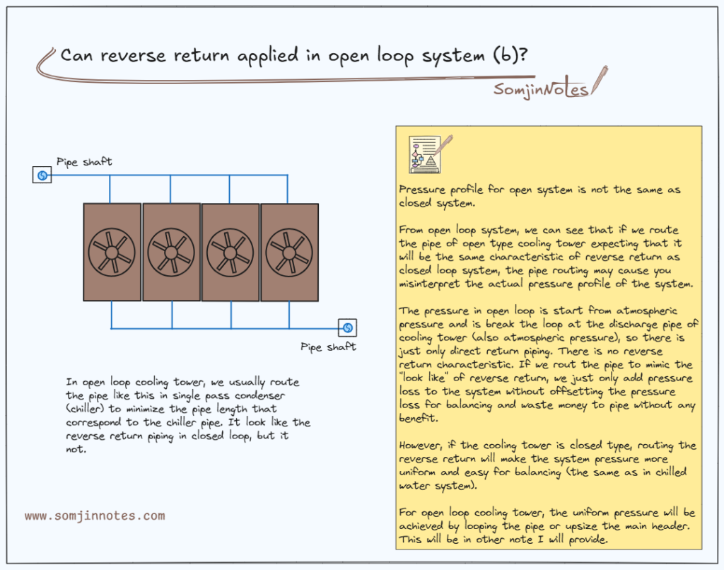 The pressure in open loop is start from atmospheric pressure and is break the loop at the discharge pipe of cooling tower (also atmospheric pressure), so there is just only direct return piping. There is no reverse return characteristic. If we rout the pipe to mimic the “look like” of reverse return, we just only add pressure loss to the system without offsetting the pressure loss for balancing and waste money to pipe without any benefit.