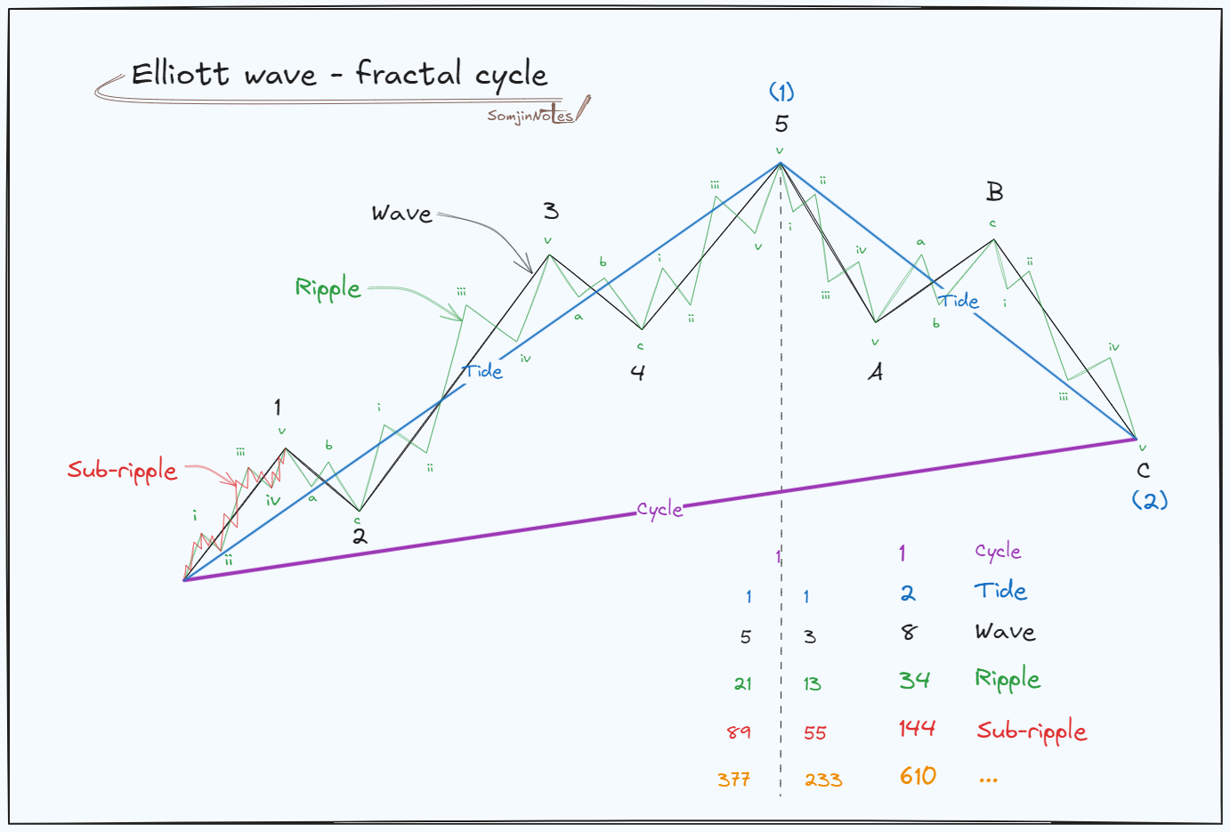 จากรูป แกน y คือราคา แกน x คือเวลา ทั้งนี้ Elliott wave principle ถูกพัฒนามาจากการ สังเกตุพฤติกรรมราคาโดย Ralph Nelson Elliott ในปี 1930s และพบว่าในเชิงสถิติแล้ว Financial market มี Price movement หรือ Price pattern ที่เกิดขึ้นซ้ำแล้วซ้ำเล่า และใน Wave ใหญ่ จะประกอบด้วย Wave ย่อย ที่มี Pattern คล้ายกัน (Wave within wave) ทั้งใน Time frame เดียวกัน หรือแม้กระทั่งต่าง Time frame กันก็ตาม (เพิ่ม หรือลด Time frame ลง) ใน Elliott wave principle เรียกสิ่งนี้ว่า Degree (จะกล่าวละเอียดในเรื่อง Wave degree ต่อไป)
